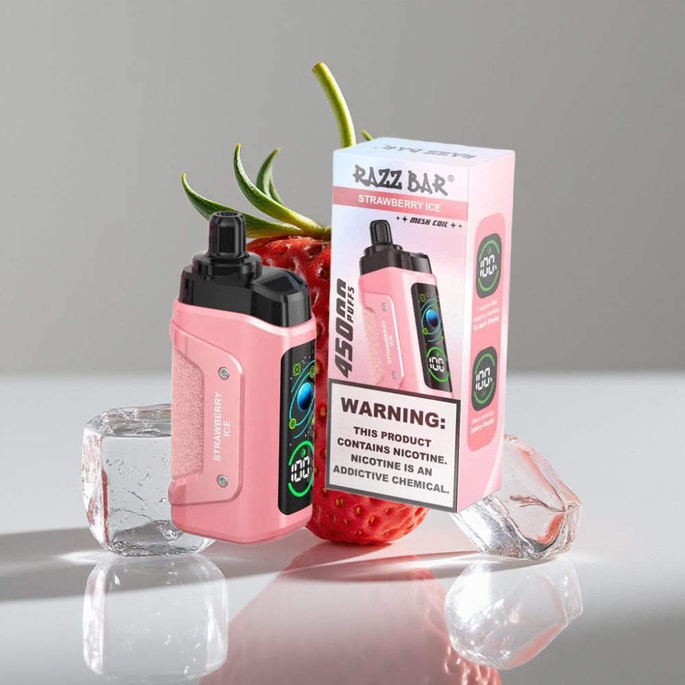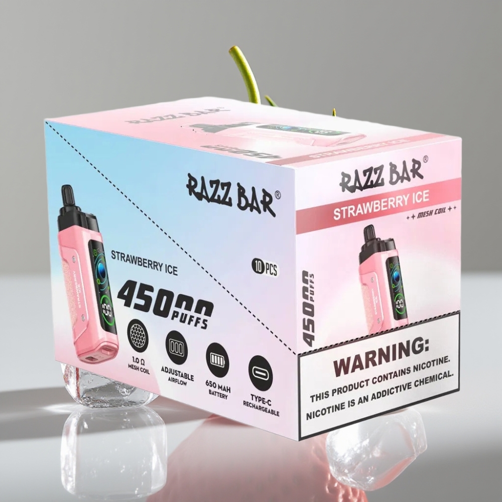 Razz Bar 45000 نَفخة فيب قابل لإعادة الشحن بنكهة الفراولة آيس مع بطارية 650 مللي أمبير وشبكة 1.0 أوم